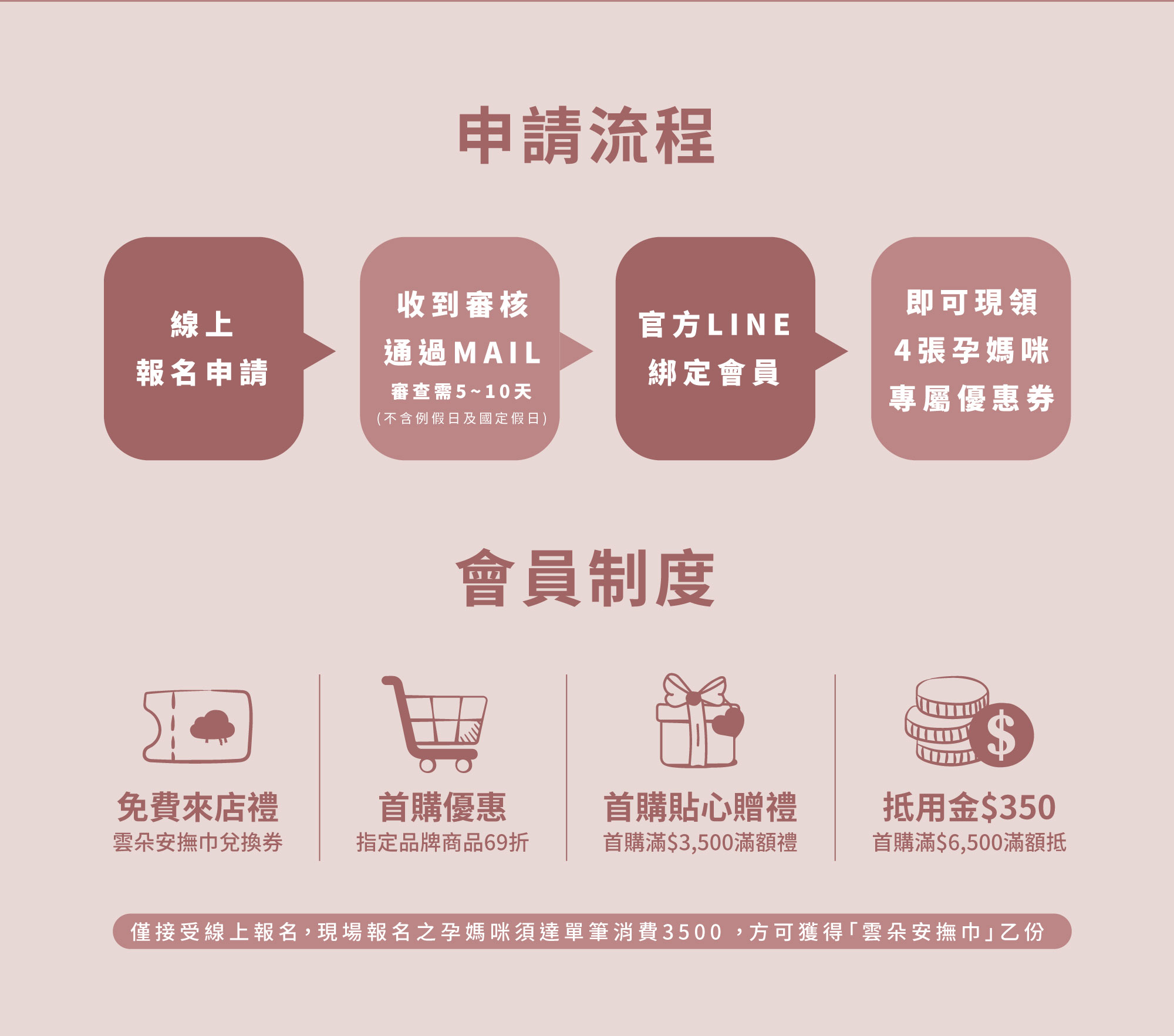 3.領取免費來店禮者需出示【審核通過MAIL】與國民健康署所發的【孕婦健康手冊】,封底處需有孕媽咪本人【身分證正本】完整姓名並與線上報名者相符。