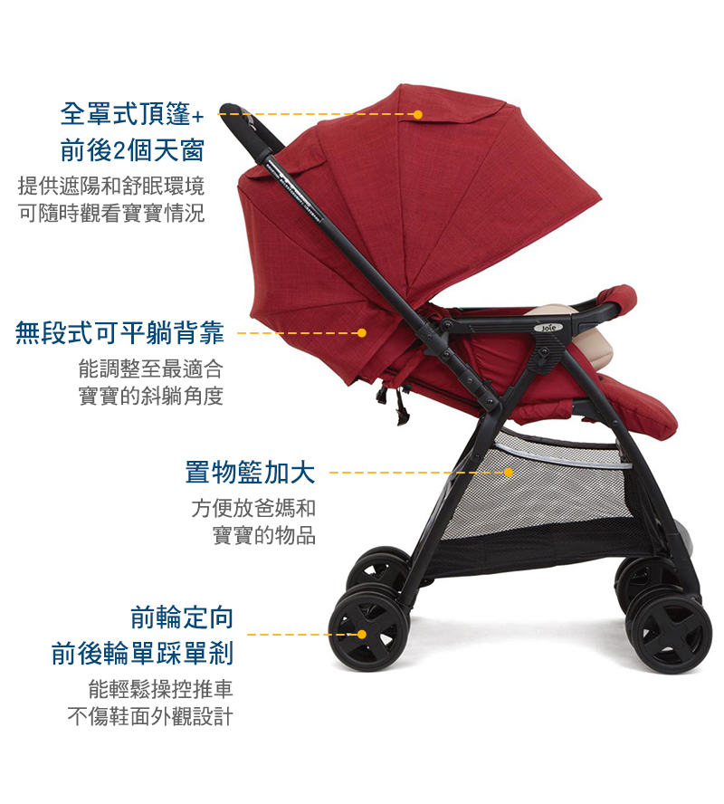 ● 無段式可平躺背靠,能調整至最適合寶寶的斜躺角度